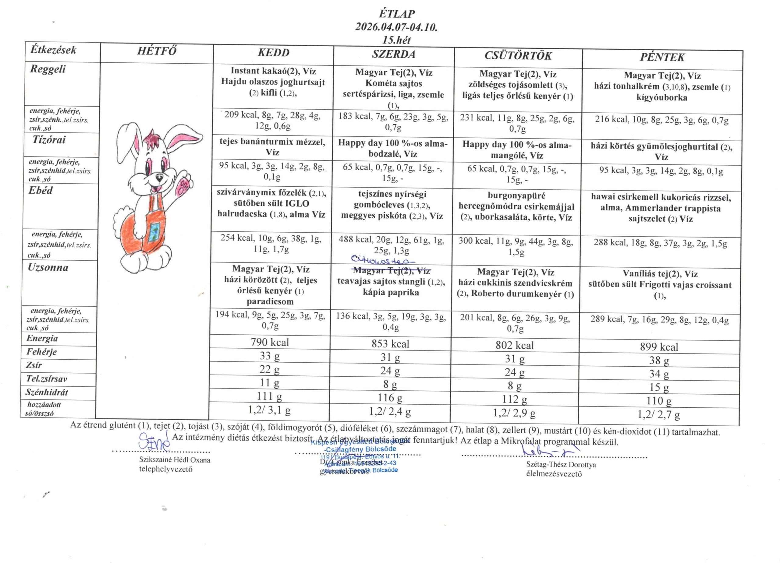 A korszerű táplálkozási elveknek megfelelően az élelmezésvezető a telephely-vezetővel és a bölcsőde orvosával közösen véleményezi és hagyja jóvá az előre elkészített étlapot, így garantálva, hogy minden étkezés megfeleljen a legmagasabb minőségi követelményeknek.